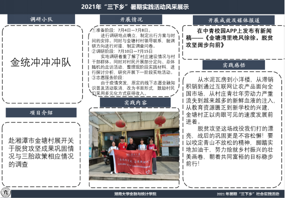 五辣姊妹小分队由五位来自金融工程和统计专业成员组成,分别是带领大家齐头并进的队长潘辛雅,以及打响完美配合战的组员侯懿珊、陈奕榕、杜易霖、孙梓艺。他们虽是初入社会的小白,却凭借认真负责的态度和强沟通力、执行力顺利打入脱贫示范点慈利县洞溪乡的内部,看到了脱贫之下的原生态社会,理解着不同人眼中的”脱贫”,表达着自己对脱贫的见解!