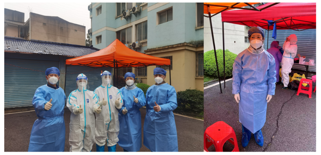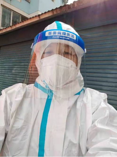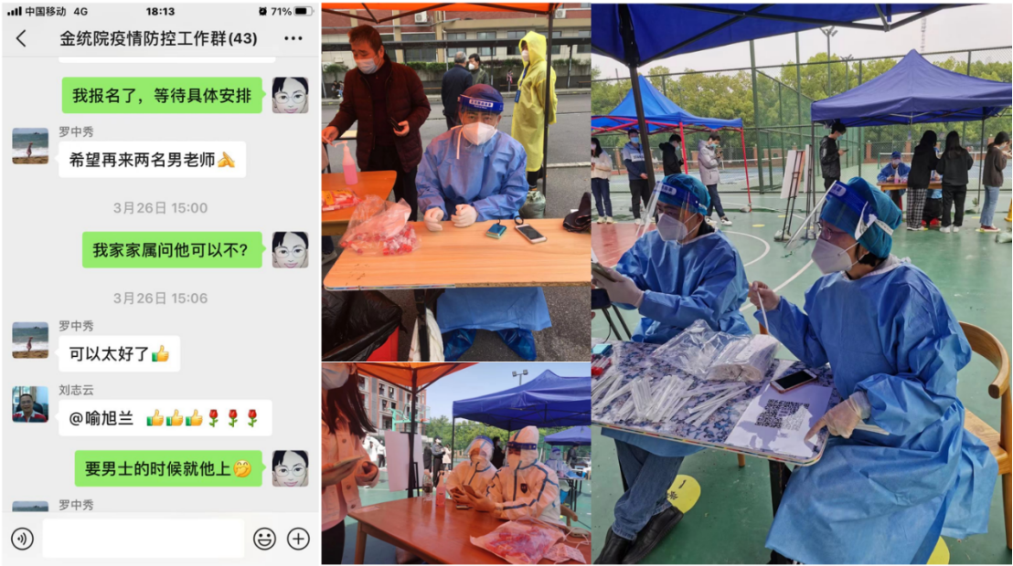 张琳教授不仅是一名教师,也是一名人大代表、政协委员,平时课程多,任务重。当得知学校需要志愿者支持抗疫工作时,她第一时间报名参加。当天,张老师被分配到龙王港园区协助做核酸检测,这是个细致的工作。她穿着防护服,进行核酸检测前的各种准备,并且两人一组负责健康码录入和分发棉签,督促学生们扫二维码,提醒学生们保持间距等。