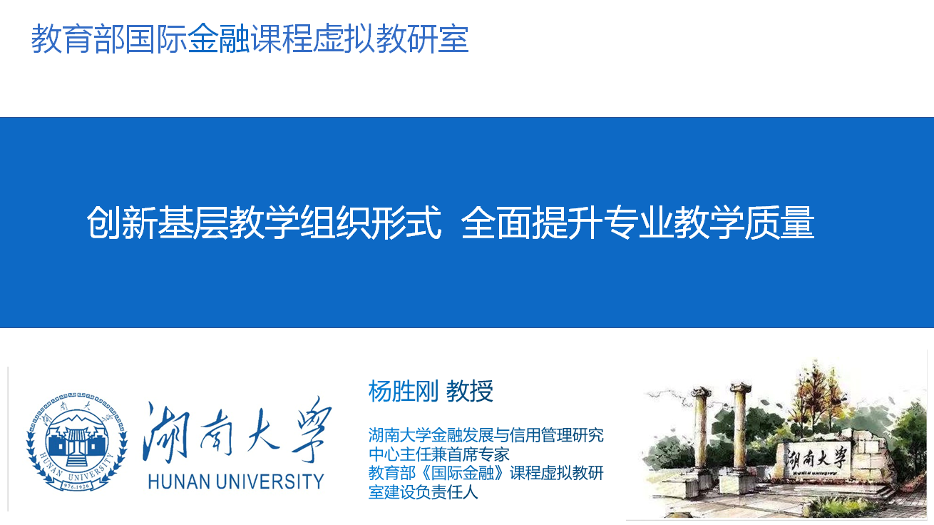 “国际金融课程虚拟教研室”是教育部首批虚拟教研室建设试点项目。该项目由国家教学名师、杨胜刚教授牵头,联合日韩av 、复旦大学、南开大学、中央财经大学、南京大学、厦门大学、中南大学、大连理工大学、天津财经大学、重庆工商大学、广东金融学院和湖北经济学院共12所高校(排名不分先后),汇集一批由国家级和省级教学名师领衔、长期从事国际金融课程教学的教师团队共同建设。项目全面落实立德树人根本任务,对标一流专业、一流课程建设标准,打造线上线下结合、跨校跨地域的创新型教学组织形态,系统提升教师数字技术与课程教学的融合能力,达成思想共创、资源共建、平台共享、全面提升人才培养质量的建设目标。