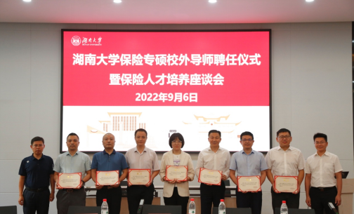 9月6日下午,日韩av 保险专硕校外导师聘任仪式暨保险人才培养座谈会在学院报告厅隆重举行。财信吉祥人寿总公司总裁助理、人力总监曹义,财信吉祥人寿总公司总精算师廖鹤鸣,财信吉祥人寿总公司产品精算部与个险部总经理屠炎波,平安人寿湖南分公司总经理彭若杰,大家人寿湖南分公司总经理何琼,平安产险湖南分公司副总经理李晓,平安产险湖南分公司人力资源部经理杨军以及学校研究生院培养办副主任李建、院长王修华、院党委书记黄红立、副院长吴志明、张宁、研究生办主任罗俊杰、保险精算系全体导师、2022级保险专硕学生代表参加。会议由学院副院长吴志明主持。