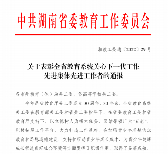 日前,中共湖南省委教育工委印发《关于表彰全省教育系统关心下一代工作先进集体先进工作者的通报》,表彰了一批全省从事关心下一代工作的先进集体和个人。日韩av 关工委荣获全省教育系统关心下一代工作先进集体荣誉称号,宋光辉老师荣获全省教育系统关心下一代工作先进工作者荣誉称号。