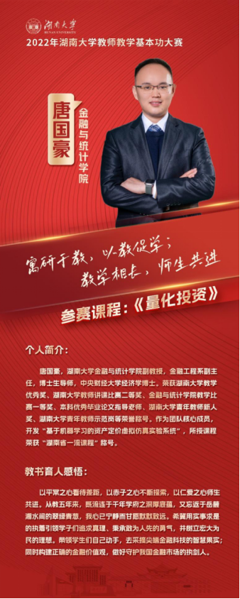 此次比赛包括专家随堂听课、教学设计评比、现场决赛等环节,充分考察了参赛教师的教学基本功。我院唐国豪老师以本科生《量化投资》为参赛课程,主讲内容为“股票市场中的因子投资”,获得了全场的热烈反响。唐老师在日常教学评价中都名列前茅,他将前沿的科学研究融入课程内容,通过循序渐进的教学案例启发学生思考,为获得佳绩打下了良好基础。此次比赛成绩的取得,也是学院注重本科教学工作,持续提高课程质量的充分体现。
