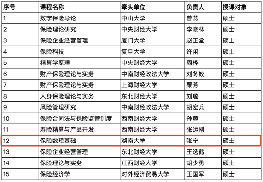 近日,全国保险专业学位研究生教育指导委员会公布了2023年全国保险专业学位研究生在线示范课程计划建设团队评选结果。经过评审,来自全国11个培养单位的15个课程教学团队入选,其中,我院张宁教授负责的《保险数理基础》课程教学团队入选。