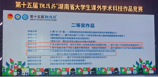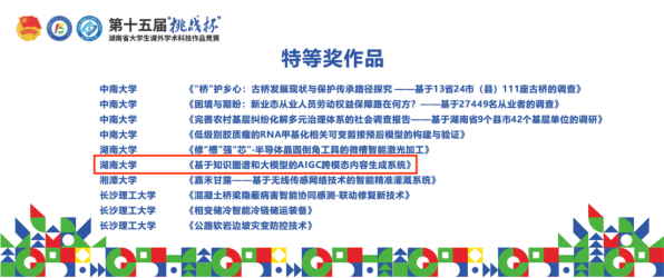 由我院张宁老师、王修华老师指导,王淑禾等同学申报的项目《基于知识图谱和大模型的AIGC跨模态内容生成系统》以科技发明制作B类赛道第一名的成绩荣获特等奖;由张立军老师、任英华老师指导,李慎之等同学申报的项目《生儿育女何所优:新时代青年人生育焦虑现状及缓解对策——基于5省1394名青年的调查研究》和由成程老师、徐照宜和杨胜刚老师指导,陈润九等同学申报的项目《价值重塑还是流量狂欢:直播带货对共同富裕的影响分析与优化对策——基于67家农产品电商与4837位农民的调查研究》荣获哲学社会科学类赛道二等奖。