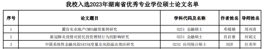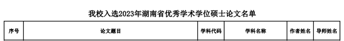 近日,湖南省教育厅公布了2023年湖南省优秀硕士学位论文,我院共有8篇论文入选湖南省优秀硕士学位论文,这8篇论文分别由我院明雷老师、周再清老师、何娟文老师、任英华老师、马威老师指导。