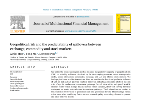 近日,我院金融学(金融工程)专业2020级本科生郝心蕾同学在马勇教授的指导下以第一作者身份在国际重要金融学SSCI期刊《Journal of Multinational Financial Management》(JCR 二区,院定B类期刊)发表了题为“Geopolitical risk and the predictability of spillovers between exchange, commodity and stock markets”的研究论文。