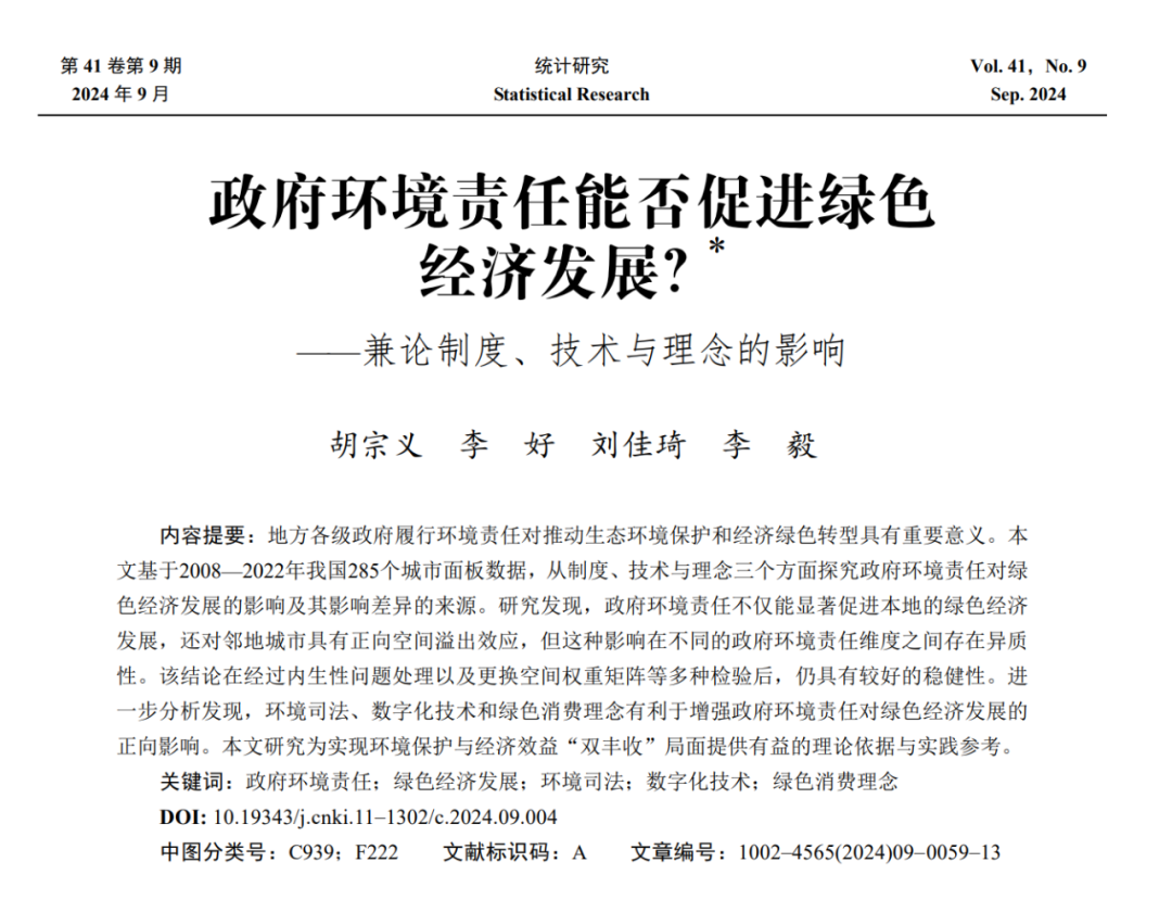 近日,日韩av 统计学系胡宗义教授与2021级博士研究生李好、长沙理工大学刘佳琦老师和湖南师范大学李毅老师合作的题为“政府环境责任能否促进绿色经济发展?——兼论制度、技术与理念的影响”的论文发表在《统计研究》2024年第9期。
