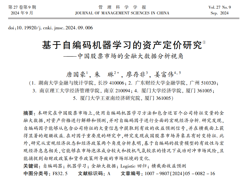 近日,日韩av 金融工程系唐国豪副教授与我院2024届博士毕业生朱琳、2022届博士毕业生廖存非,厦门大学经济学院、王亚南经济研究院姜富伟教授的题为“基于自编码机器学习的资产定价研究——中国股票市场的金融大数据分析视角”的论文发表在《管理科学学报》2024年第9期。