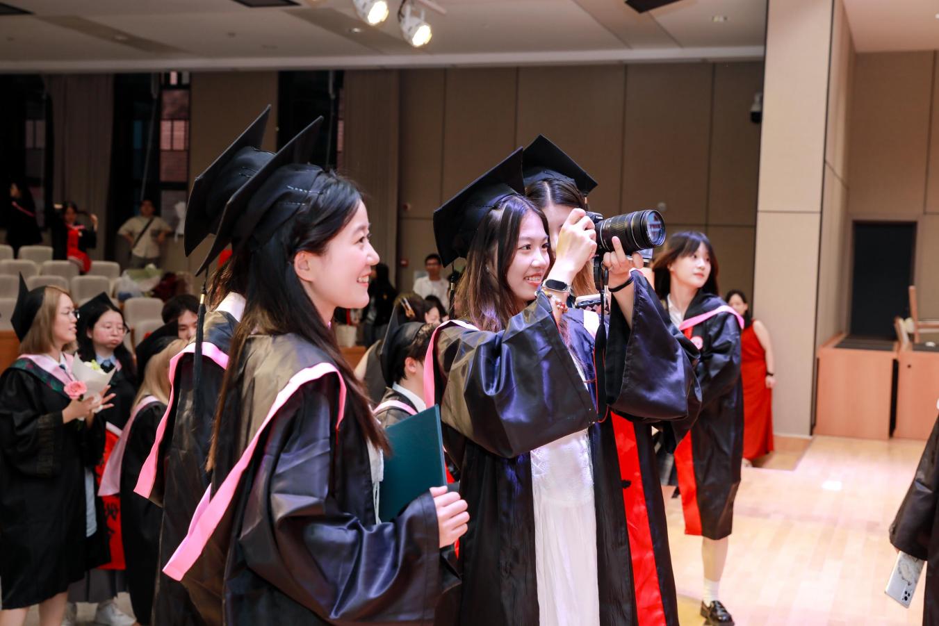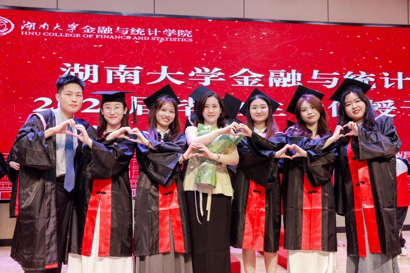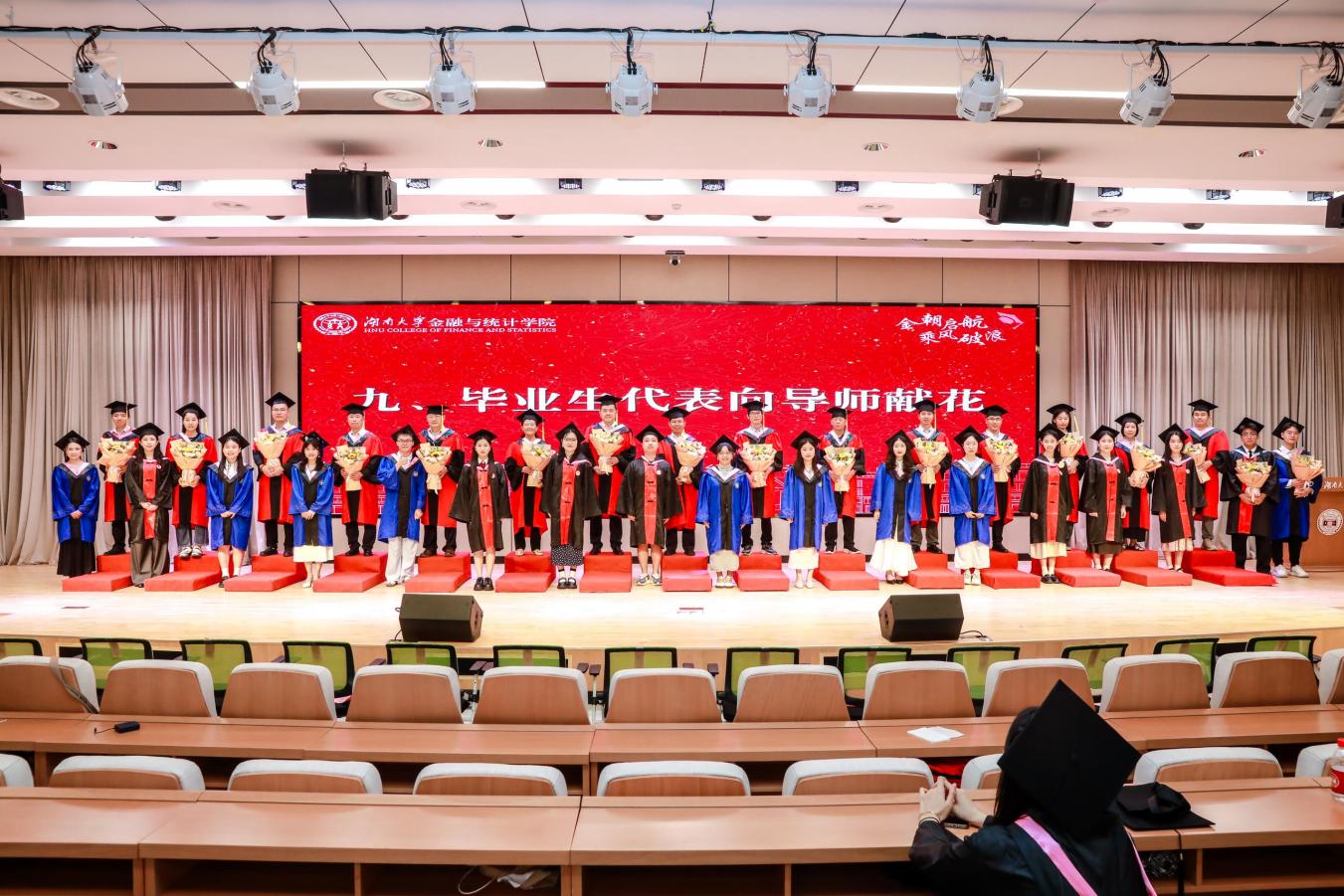 院学位评定分委员会委员、导师代表为毕业生颁发学位证书并拨正流苏,毕业生依次上台领取学位证书,留下珍贵的合影。随后,毕业生代表向老师们献花,感谢师恩。