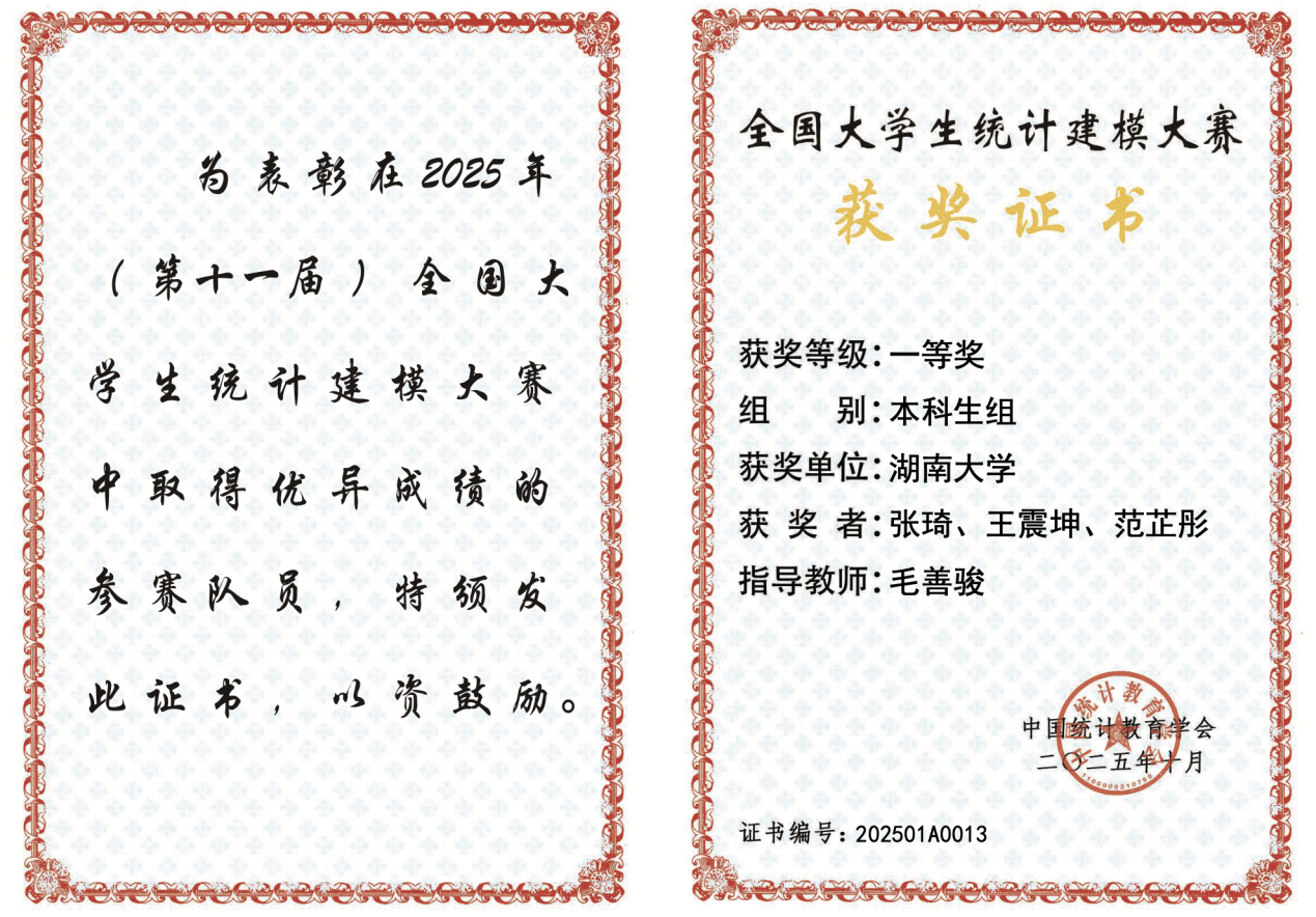 近日,第十一届全国大学生统计建模大赛(以下简称大赛)总决赛在东北财经大学成功举办。日韩av 共有6支队伍入围国赛,分别获得本科生组全国一等奖1项、二等奖1项和三等奖3项,研究生组全国二等奖1项。