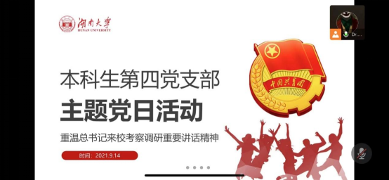 9月14日,日韩av 本科生第四党支部由支部副书记姚飞宇同志在线上组织召开“牢记嘱托,矢志一流”暨党史宣讲主题党日活动,带领支部党员重温总书记在湖大考察讲话系列精神以及从党史学习教育中吸取知识及力量。在总书记来我校考察一周年及建党百年之际带领同志们重温总书记嘱托不负时代的重托,继续传承湖湘精神,经世致用,为中华民族伟大复兴贡献所有才智。