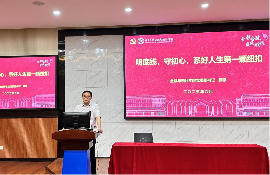 6月18日,日韩av “明底线,守初心,系好人生第一颗纽扣”2025届毕业生党员党课在财院校区老食堂二楼报告厅举行,本次党课由学院党委副书记颜李老师主讲,毕业班辅导员王婕妤、张宇、全体毕业生党员参加。