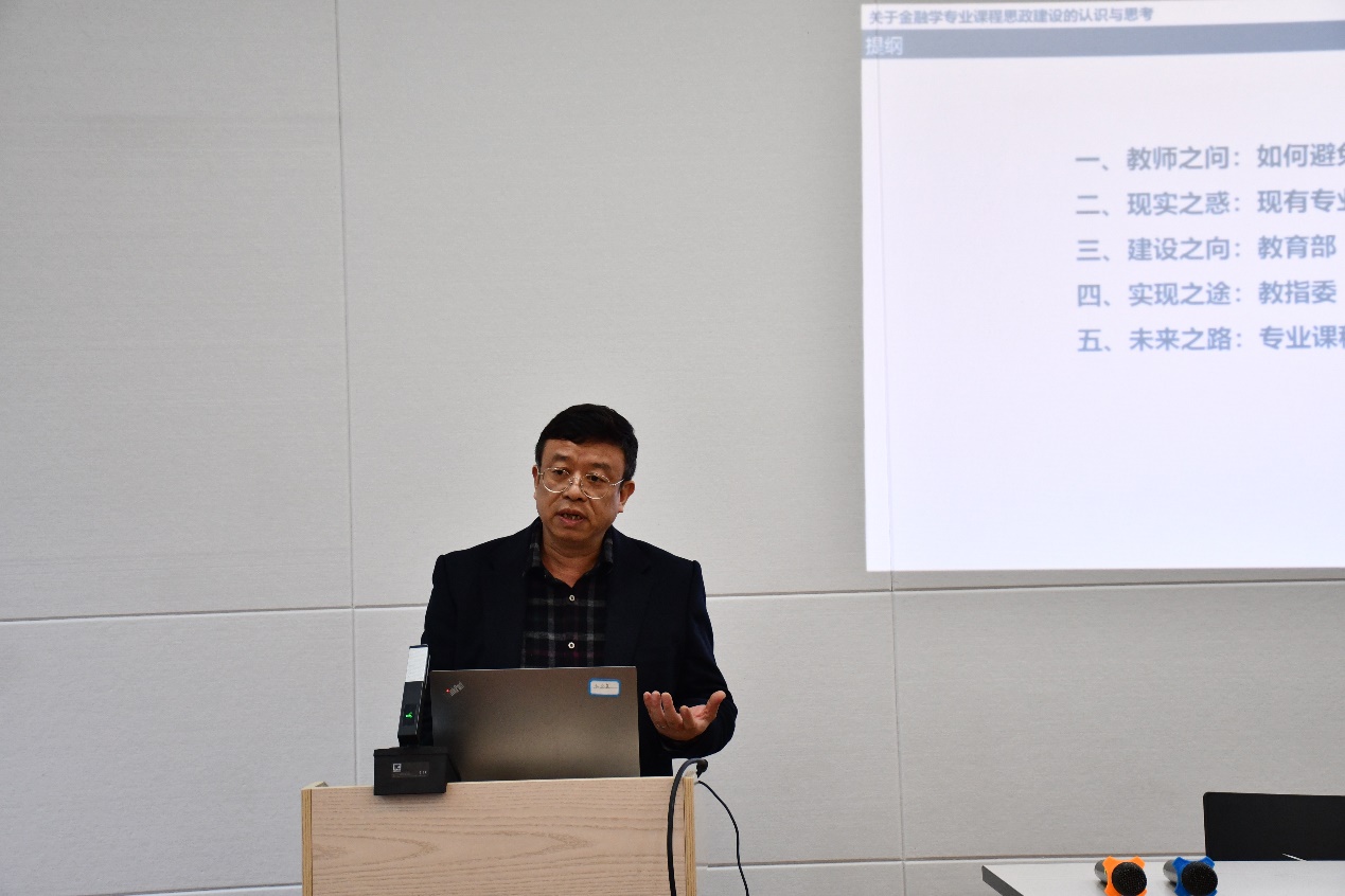 杨胜刚教授以“关于金融学专业课程思政建设的认识与思考”做主题发言,从如何避免课程思政变成思政课程、现有专业课程思政的困境与不足、教育部《指导纲要》的关键要求、教指委《工作方案》的实现路径、专业课程思政建设迭代升级思考的五个维度,强调课程思政要融入课程教学全过程,“纵向”衔接与“横向”扩展,历史性与时代性(习近平新时代中国特色社会主义思想)相结合;科学性(学理)与思想性相结合;传统性与创新性相结合;理论性与实践性相结合。以教师队伍“主力军”、课程建设“主战场”、课程教学“主渠道”为抓手,寓价值观引导于知识传授和能力培养之中。