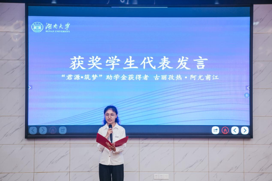 “君源·筑梦”奖学金获奖博士生张人中结合亲身体会,感谢校友在博士求学之路上的关怀与帮助。“君源·筑梦”奖学金获奖团队负责人王淑禾分享“薪火芳华”团队的创新创业故事,展示了金统学子扎实的创新创业能力素养和良好的精神风貌。“君源·筑梦”助学金获得者古丽孜热·阿甫尤江说,“在疫情期间,学校给予了充分的关爱和经济补助,感谢辅导员谢君老师像妈妈一样的陪伴和鼓励。”农金励志奖助学金获得者张艺聪代表全体受助学生感谢校友的温暖帮助,饱含深情地说道,“我们每个人都是雄鹰,可以展翅高飞。”
