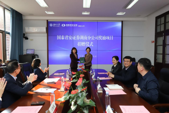 11月29日下午,日韩av “国泰君安证券湖南分公司奖励项目”捐赠仪式在日韩av 2号楼226会议室隆重举行。